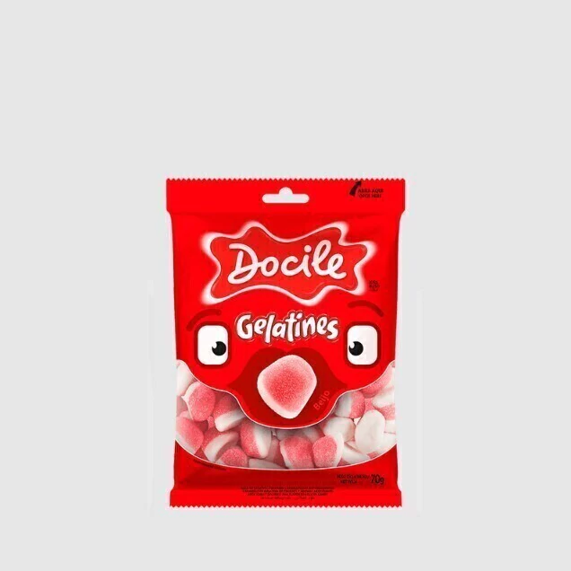 As balas de gelatina são feitas com gelatina, açúcar e glucose. Consideradas um produto nobre, por conterem entre seus principais ingredientes a gelatina - muito consumida em todo o mundo por crianças, jovens e adultos. A linha Gelatines da Docile oferece balas coloridas, com formatos divertidos e exclusivos e é a opção mais saborosa do mercado. Possui diversos tipos de cobertura e sabores, que vão dos docinhos aos azedinhos. Oferecem um momento mágico ao paladar e uma nova descoberta para os sentidos com suas texturas que podem ser de açúcar ou com confeitos crocantes de miçangas. Perfeitas para a decoração de mesas justamente por oferecer muitos acabamentos, cores e formatos. Os itens Cão e Gato, Tênis, Porquinhos e os Ursinhos ficam de pé como se fossem pequenos bonequinhos! Explore sua criatividade com as Gelatines!