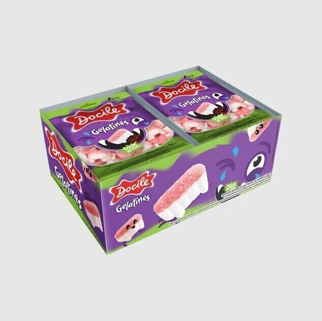 As balas de gelatina são feitas com gelatina, açúcar e glucose. Consideradas um produto nobre, por conterem entre seus principais ingredientes a gelatina - muito consumida em todo o mundo por crianças, jovens e adultos. A linha Gelatines da Docile oferece balas coloridas, com formatos divertidos e exclusivos e é a opção mais saborosa do mercado. Possui diversos tipos de cobertura e sabores, que vão dos docinhos aos azedinhos. Oferecem um momento mágico ao paladar e uma nova descoberta para os sentidos com suas texturas que podem ser de açúcar ou com confeitos crocantes de miçangas. Perfeitas para a decoração de mesas justamente por oferecer muitos acabamentos, cores e formatos. Os itens Cão e Gato, Tênis, Porquinhos e os Ursinhos ficam de pé como se fossem pequenos bonequinhos! Explore sua criatividade com as Gelatines!
