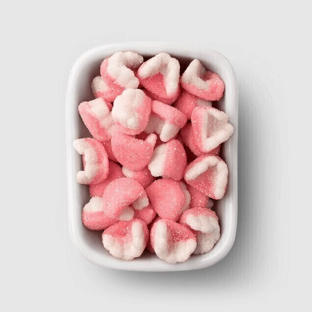 Informações NutrionaisPorção de 20g (13 unidades)Quantidade por porção%VD*Valor Calórico62 kcal =262 kJ3%Carboidratos14 g5%Proteínas1,2 mg2%Sódio8 mg0%“Não contém quantidade significativa de gorduras totais, gorduras saturadas, gorduras trans e fibra alimentar."* % Valores diários de referência com base em uma dieta de 2000 Kcal ou 8400 kJ. Seus valores diários podem ser maiores ou menores dependendo de suas necessidades energéticas.IngredientesXarope de glicose, açúcar, água, gelificante gelatina, acidulantes ácido cítrico e ácido málico, corante inorgânico dióxido de titânio, aromatizante e corante artificial vermelho 40.NÃO CONTÉM GLÚTEN.