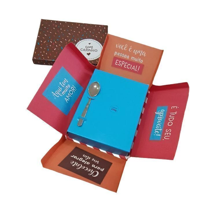 Caixa de papel cartão. A famosa caixa surpresa. que você tira a tampa e ela abre os quatro lados agora em versão para ovo de Páscoa. É ideal para ovos de colher de 350 gramas.