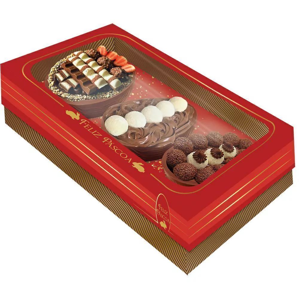 Na mesma embalagem é possivel encaixar 3 Ovos de Páscoa com 3 tamanhos diferentes cada.