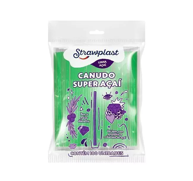 O Canudo Super Açaí é perfeito para quem gosta de tomar o açaí de canudinho! É mais largo, com diâmetro de 10mm, por isso não entope e você tomar seu açaí sem entupir! O açaí já faz parte do dia a dia dos brasileiros. Leva sabor, saúde e energia para encarar os desafios. Isso que é potência! Linha Açaí, a cara do Brasil, a cara da Strawplast!