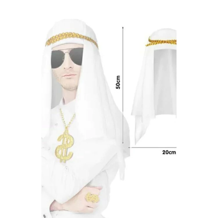 Transforme seu visual com o Chapéu Turbante Sheik Árabe, perfeito para festas à fantasia e eventos temáticos. Feito de poliéster na cor branca, este acessório possui 50 cm de comprimento, oferecendo conforto e estilo para adultos.