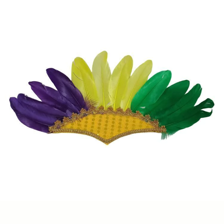 Possuindo composição com diversas penas coloridas ao redor do cocar e na base do cocar uma forma arabesca dourada anexada junto com um tom diferente de Colorido decorado com lantejoulas, deixando super bonita e chamativa para se fantasiar no carnaval