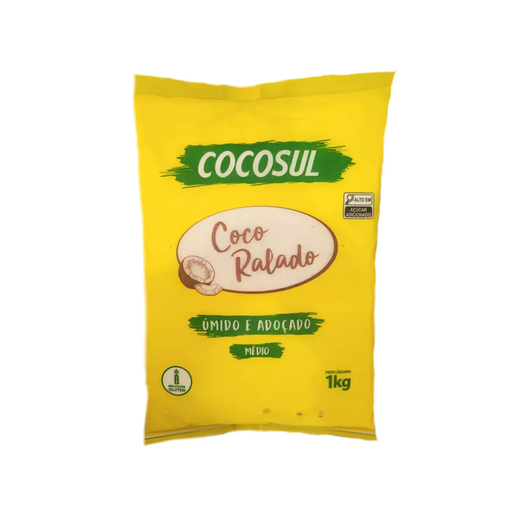 Amêndoa de coco desidratada, ralada integral; Sacarose. Fécula de mandioca, sal, conservante metabissulfito e sorbato de potássio. NÃO CONTÉM GLÚTEN.