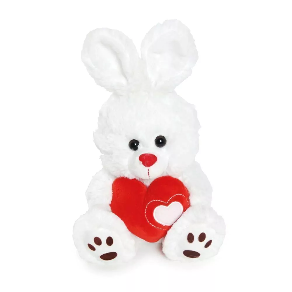 Coelho de pelúcia branco com enchimento de manta acrílica, segurando coração. 27cm.